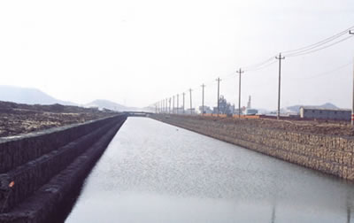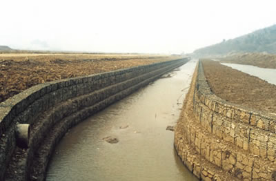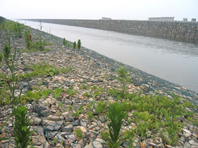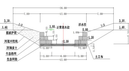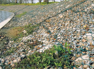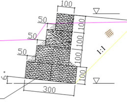 護坡結(jié)構(gòu)包括枯水位以下部位的護腳和枯水位以上部位的護坡兩部分。網(wǎng)墊厚度根據(jù)水流速度確定,以達到#優(yōu)安全性和經(jīng)濟性,一般采用厚度為0.2m-0.5m的網(wǎng)墊。坡比一般1:1.5-3,可根據(jù)土的內(nèi)摩擦系數(shù)和土與網(wǎng)墊的摩擦系數(shù)確定。
