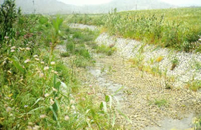 河道整治護坡目前大多采用塊石或預(yù)制混凝土塊結(jié)構(gòu)型式,重點解決河道受河水沖刷的邊坡穩(wěn)定問題,而忽視了河道生態(tài)功能;格網(wǎng)護坡是一種既能確保邊坡穩(wěn)定,又能維護和恢復(fù)河道生態(tài)的結(jié)構(gòu)型式。
